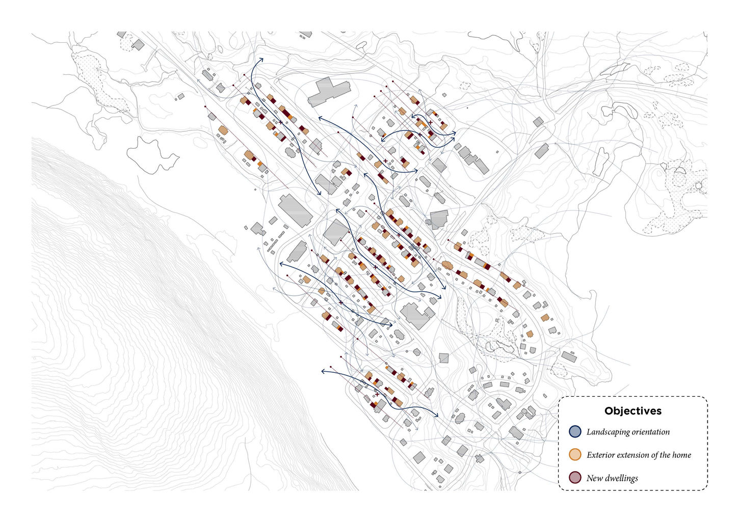 A lattice of bike and pedestrian pathways complements the vehicular streets to improve overall safety. New housing types and additions to existing houses express local know-how through self-building. They also offer new outdoor spaces—shared “in-between” platforms, workshops, open backyards—to do cultural activities, and share knowledge and know-how.